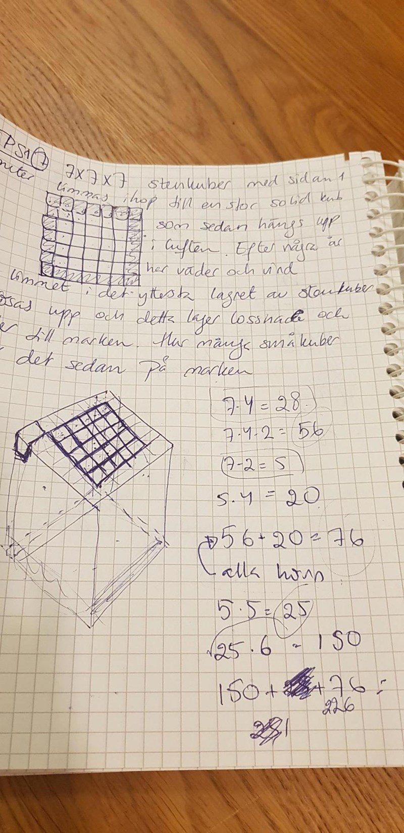 Jag har räknat ut nu alla 6 sidors småkuber och fik de till 226 st, men jag får fortfarande fel svar.