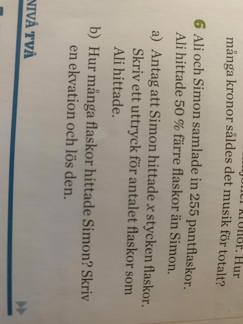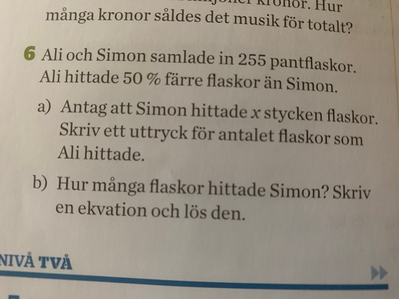 För uppgift a) kan det vara användbart att tänka sig att 50% mindre innebär att det är hälften så mycket som det hela, i det här fallet x. För b) är det bara att addera uttrycken för Ali och Simon, sätta 255 i andra ledet av ekvationen och lösa den.