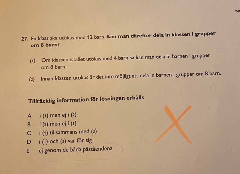 (1) säger att om man utökar med 4 kan man dela in klassen i grupper med 8 barn i varje grupp. Men 4 + 8 = 12, så att utöka med 12 innebär att man utökar med 4 barn och sedan 8 till som kan vara i en egen grupp. Alltså kommer det att gå, och (1) räcker för att besvara frågan.