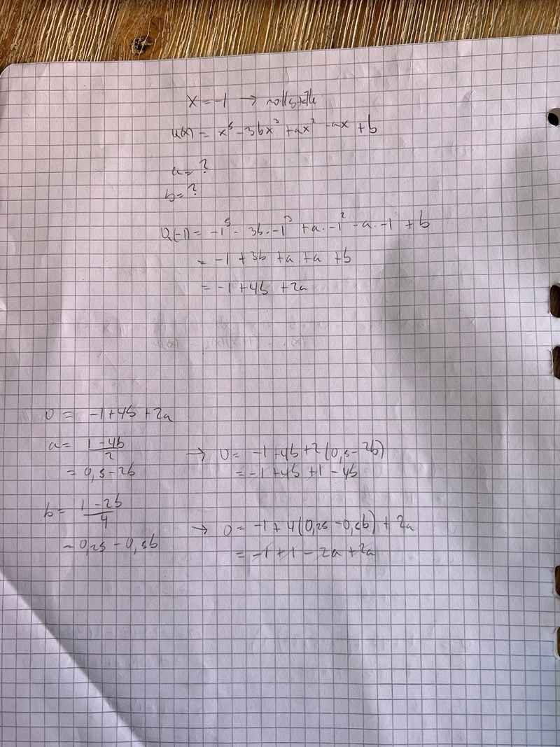 Jag har testat att sätta q(-1) då x=1 motsvarar nollställe, efter jag har förenklat ekvationen så hamnar jag i att q(-1)=-1+4b+2a. Därefter så försöker jag bryta ut a genom att ta 0=-1+4b+2a för att sedan sätta in a:s värde in i ekvationen för att ta reda på b. Men när jag testar det så tar termerna ut varandra i HL (bifogar en bild), hur ska jag gå tillväga mvh?