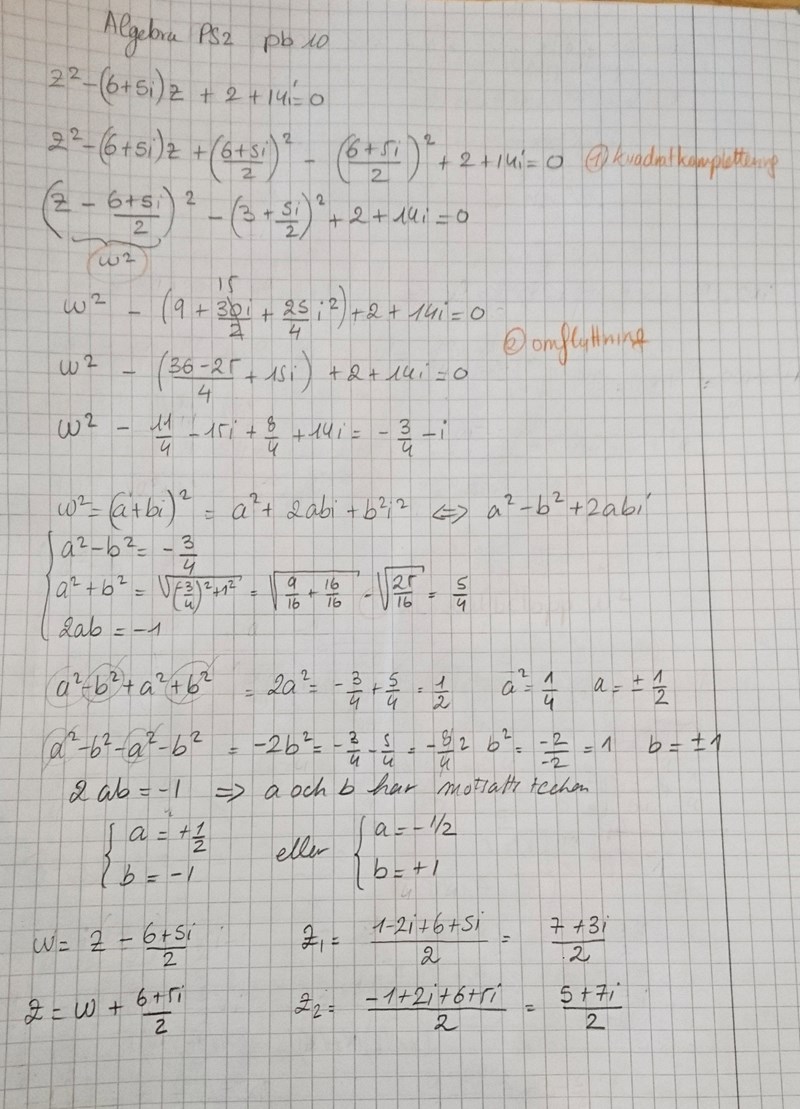 Om man låter WolframAlpha lösa ekvationen och sedan substituerar tillbaka till z, får man samma svar som när WA löser ursprungsekvationen direkt. Alltså borde det vara rätt så långt. Då vet vi i alla fall att felet är efter det någonstans. Jag räknar vidare!