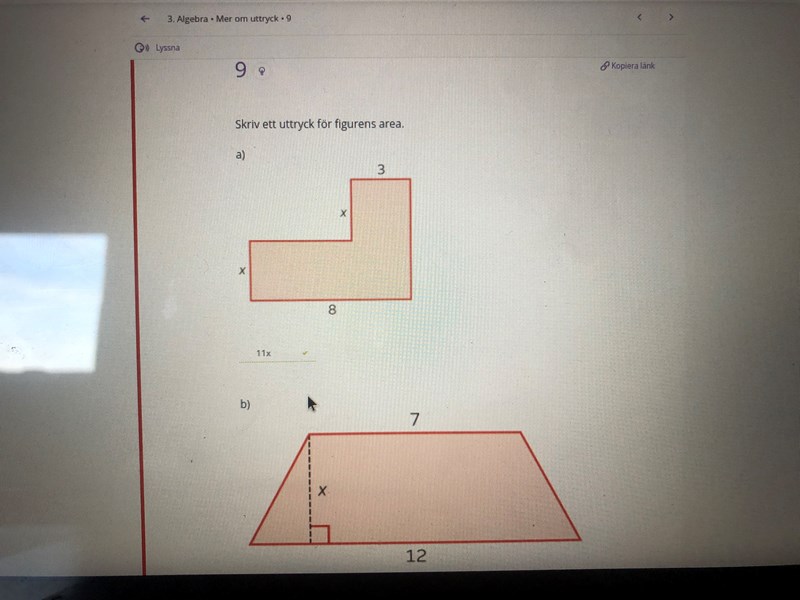 3. Är du med på att den övre rektangeln har bredden 3 och höjden x?