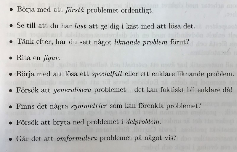 chalpire skrev:Hej jag undrar om det finns något specifikt man bör tänka på när man löser problemlösningar inom algebra.