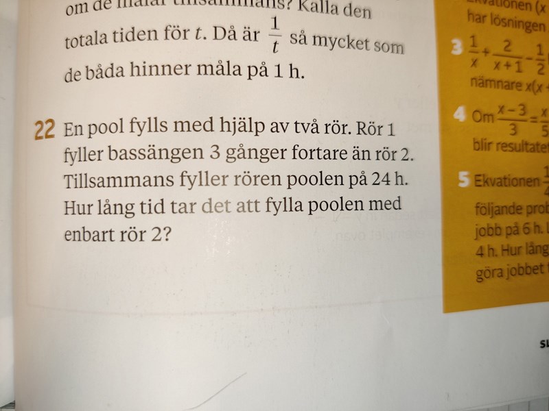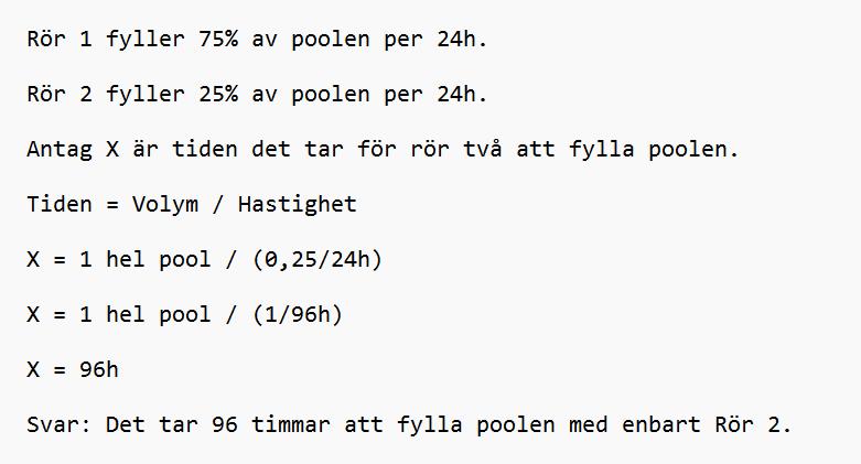 Du kan lösa uppgiften genom att X är tiden det tar för rör två att fylla hela poolen. Den kan lösas på detta sätt: