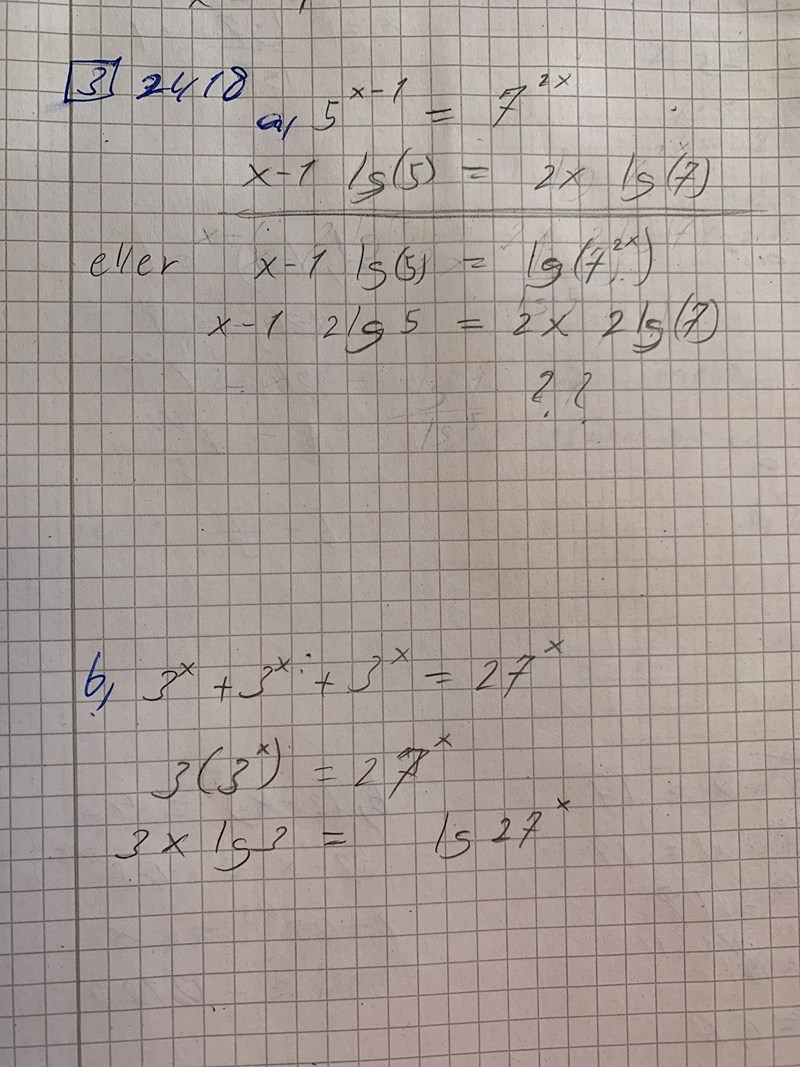 På b-uppgiften stämmer inte ditt vänsterled efter logaritmering eftersom lg(3•3x) = lg(3)+lg(3x) = lg(3) + x•lg(3) = (x+1)•lg(3), och inte det du skrev.