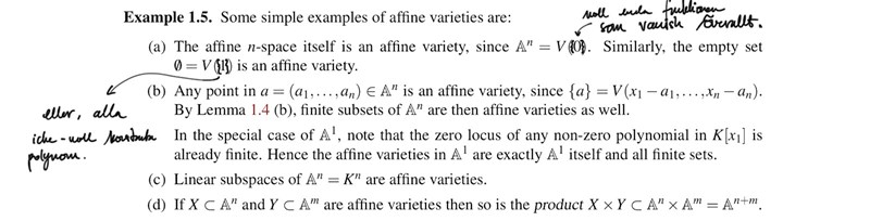 Den här kopplingen mellan den "geometriska världen" av algebraiska varietéer och den "algebraiska världen" av radikala polynomideal kallas för Hilberts Nullstellensatz, och på många sätt kan man säga att målet med klassisk algebraisk geometri är att utforska och fördjupa den här kopplingen! (Två fina snabbintroduktioner till algebraisk geometri som jag gärna promotar - förutom Gathmanns anteckningar som skärmklippet i trådstarten kommer ifrån - är det här webbinariet med Vakil och Sturmfels, och de här anteckningarna av Fitchett.)