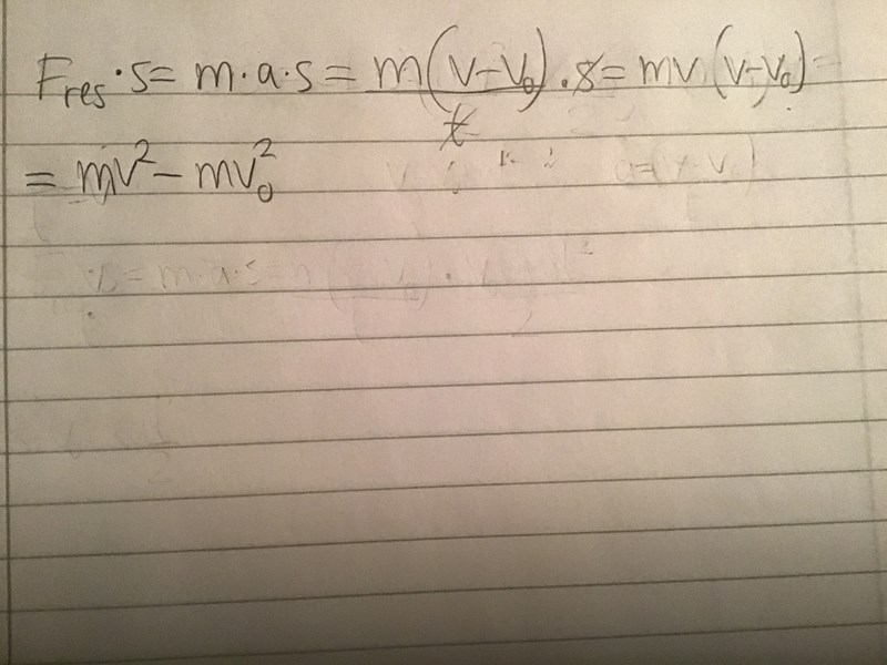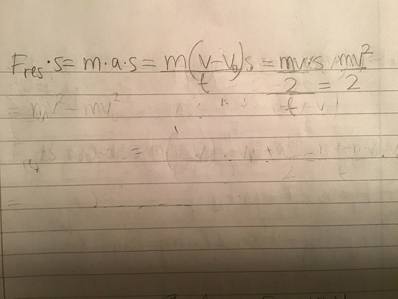 Mitt försök hittills ser ut såhär. Jag vet att jag har gjort fel eftersom kinetisk energi är (mv02 / 2) - (mv2 / 2), men jag förstår inte hur jag ska få allt dividerat med 2? Jag har använt formeln för att beräkna acceleration samt sträckan (s/t=v). Hur får jag dividerat med 2?!