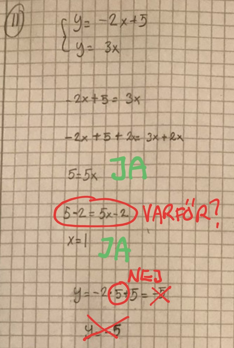 Om nej så välj en av metoderna och visa här steg för steg hur du löser ett av ekvationssystemen med den.