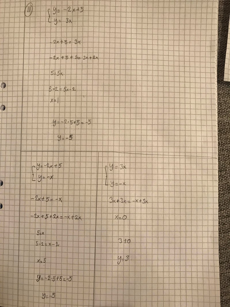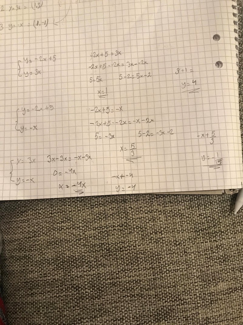 Tredje ekvationssystemet: Du börjar bra iom att du kommer fram till att x = -4x. Men nästa steg saknas, dvs att komma fram till att x = 0. Och även här saknas att ta fram y och till sist att kontrollera ditt resultat.