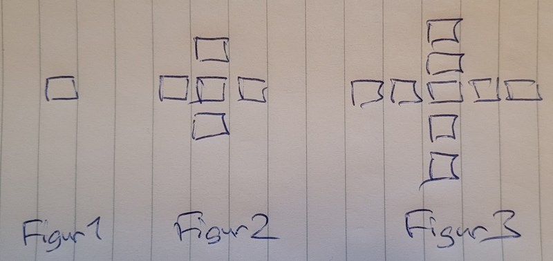 Det sådana här uppgifter med figurer handlar om är att vi skall hitta en funktion, där vi stoppar in figurnumret och ut skall vi få antalet kvadrater i det här fallet (eller stjärnor i din ursprungliga).
