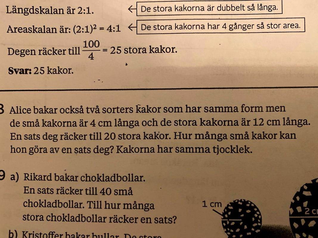 Laguna skrev:Aloosher skrev:Du vet att kakorna är lika tjocka, så det enda som ändras är deras längd, hur många gånger längre är de stora kakorna än de små kakorna?