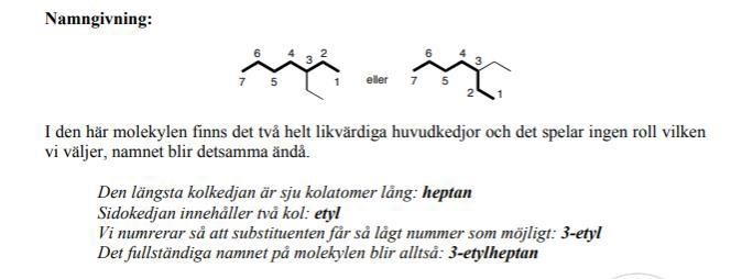 Jag förstår inte varför molekylen heter 3-etylheptan. Varifrån kom 3:an ifrån då etan har endast 2 kolatomer om det nu är kopplad till det samt vad menas med substituenten?