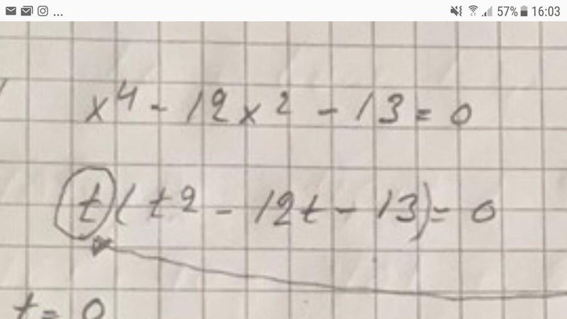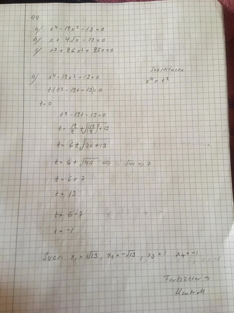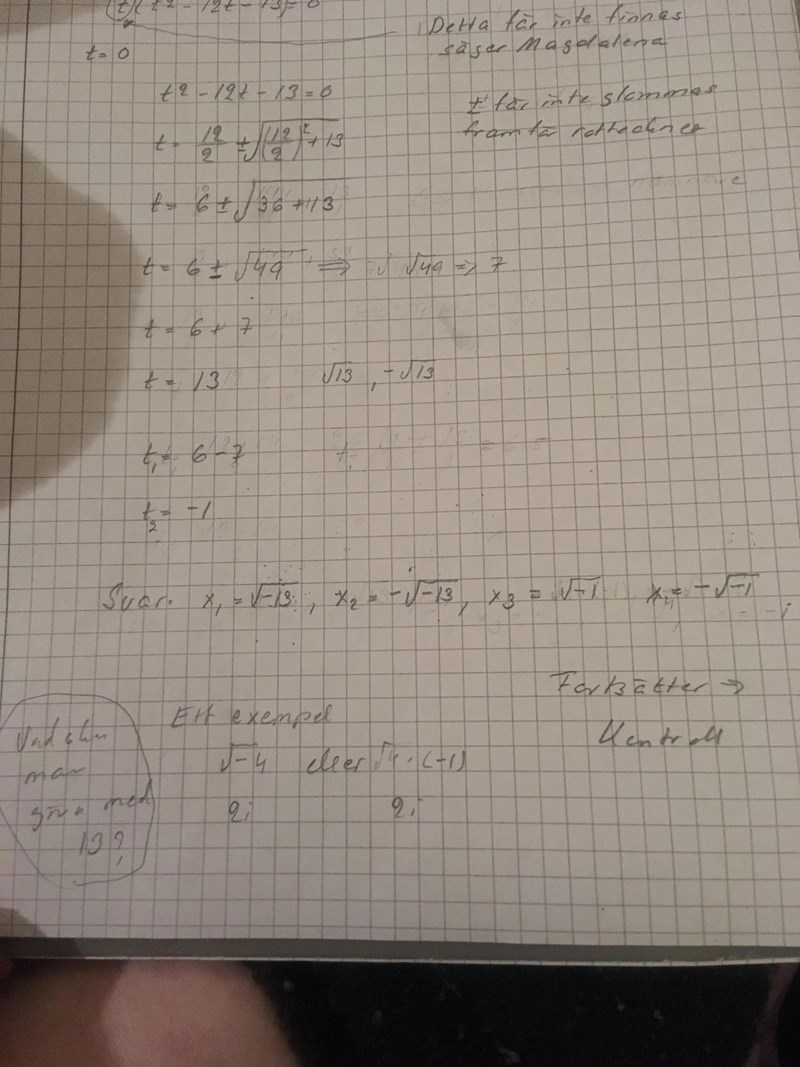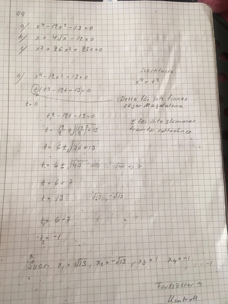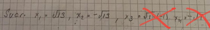 När du går tillbaka från t till x gör du rätt på de lösningarna som motsvarar t = 13 men fel på lösningarna som motsvarar t = -1. Om du sätter in dina fyra lösningar i ursprungsekvationen märker du vilka som stämmer eller inte. Du skall alltså sätta in dina fyra värden i fjärdegradsekvatione, inte i den där du har bytt ur x-kvadrat mot t.