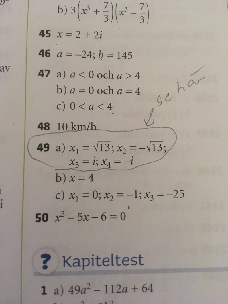 Du gör substitutionen , löser ekvationen korrekt och kommer fram till rötterna och .