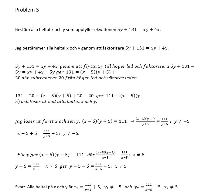 mask134 skrev:Det visste jag, så läraren har fel hon skrev att jag ska använda att (x-5) och (y+5) är heltal som multipliceras till 111.