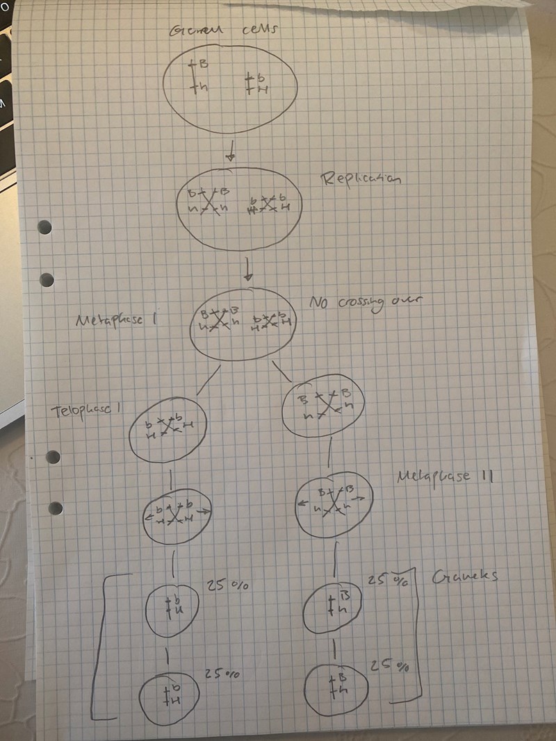 Hej! Jag har den här frågan där jag är menad att fylla i hur allelerna på kromosomerna rör sig genom meios. Men nu är jag inte säker på att jag förstår frågan. Det står att jag ska indikera rekombinanta gameter och 'parental' men eftersom det här en en autosom och X kromosom sker väl ingen överkorsning? Jag har två meioser att fylla i vilket jag hade trott skulle vara en där överkorsning sker och en där den inte gör det, men igen kan man göra så mellan en X kromosom och autosom? Jag bifogar frågan och vad jag tror svaret är, hade verkligen uppskattat hjälp!