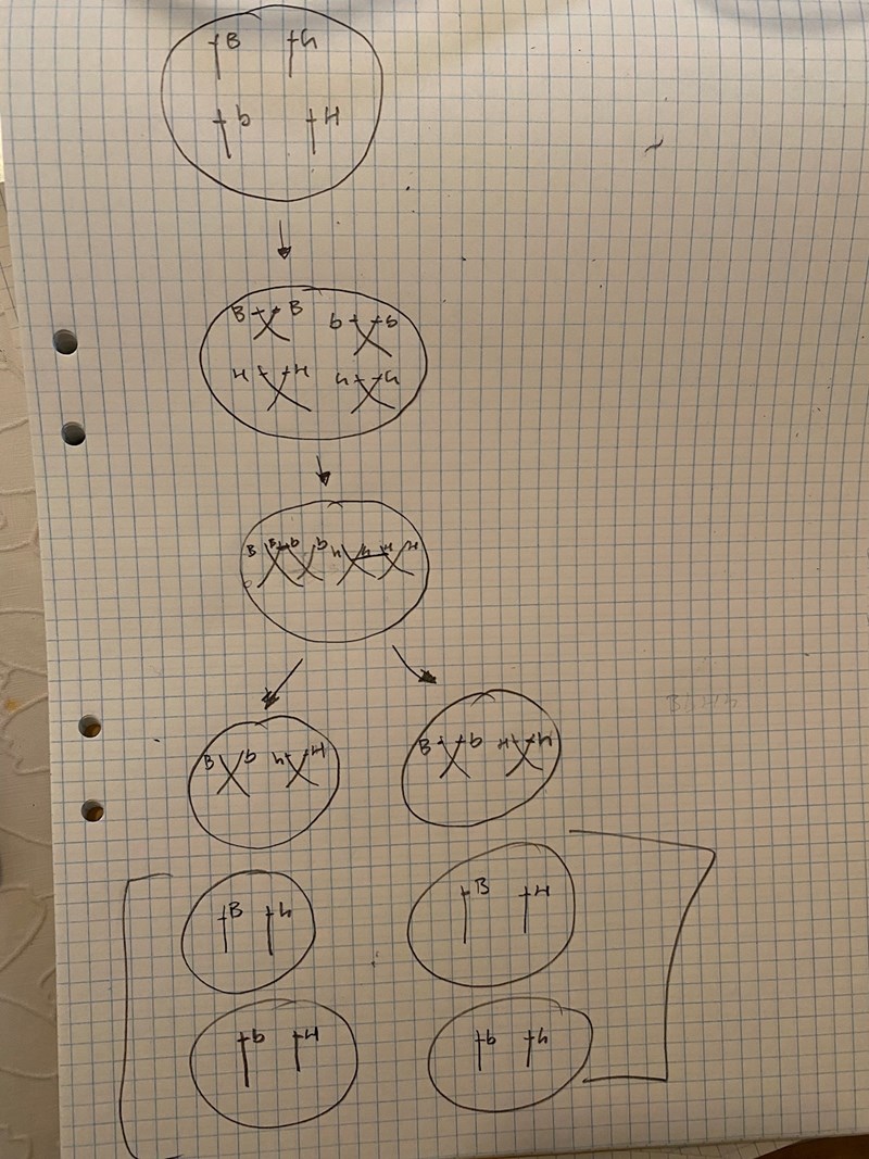 Tack så jätte mycket för svar! Jag har provat rita om och bifogar bild, stämmer detta? Nu har jag haft överkorsning ske mellan könskromosomerna och autosomerna. Men kan det bli så att det till exempel bara sker mellan autosomerna och inte könskromosomerna? Eller tvärtom?