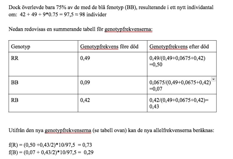 Hej, fick en upgift att räkna ut nya allelfrekvenser efter att 75% av djuren med blå fenotyp (BB) döt i ett försök med blå (B) och röda (R) alleler som nedärvs med intermediär klyvning. Jag försökte lösa de enligt följande, start värdena ficks ur uppgiften men f(B) och f(R) tycks inte bli ett (som jag tänker att de borde bli) tacksam för all hjälp: