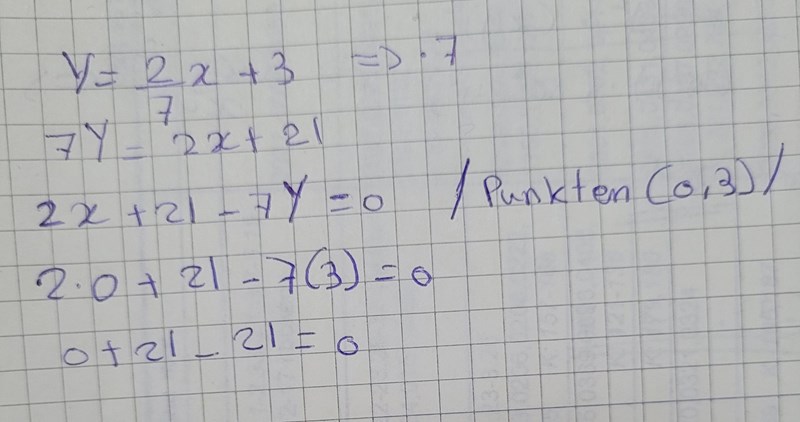 y= 2/7x+3. Och du har en punkt (-7,1).