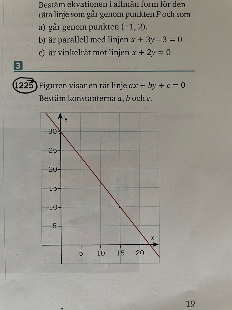 Jag förstår att man ska bestämma k och och m-värdet och jag räknar ut vad linjens ekvation är i k-form vilket blir: y= (-3x/4) +30. Som i allmängods blir: (3x/4) + y -30=0. Detta ger a= 3/4, b= 1 och c=-30. Detta är däremot inte rätt svar. Utan i facit står det att a=4, b=3 och c= -90.