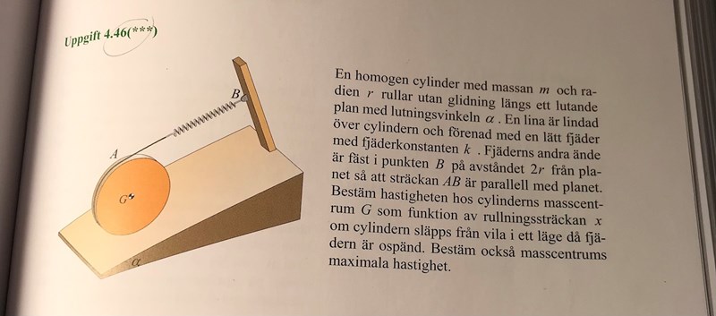 Notera att l x. Tänk på att cylindern roterar så att mera tråd vindas upp på cylindern hela tiden, vilket gör att fjädern dras ut ännu mer än bara x. Om cylindern roterat en vinkel så vindas längden r tråd upp på cylindern, så att avståndet mellan punkten A och fjädern minskar i motsvarande grad.