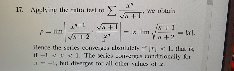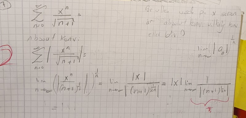 Micimacko skrev:Rottest går väl jättebra? Ditt uttryck går mot |x|*1 när n går mot oändligheten, och det är mindre än 1 när |x| är mindre än 1, så du bör ha kommit fram till samma sak som facit där, att serien är absolutkonvergent innan +-1.