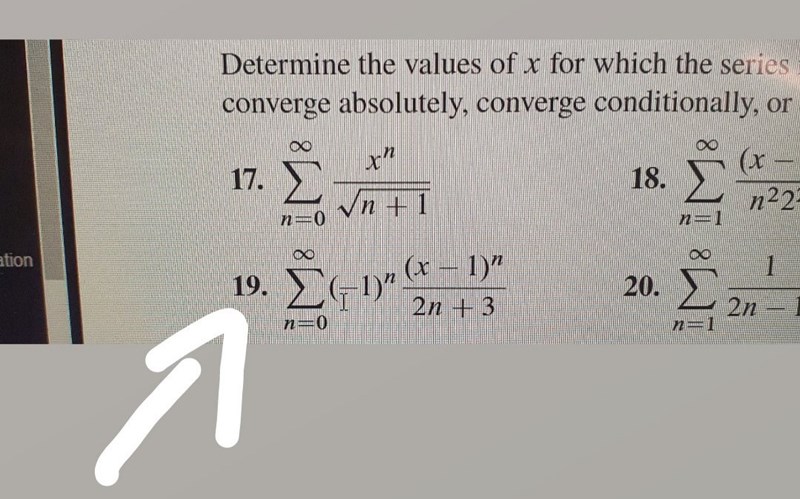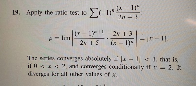 I facit de har inte visat hur man ska man gå till väga för att visa för vilken värde serien är villkorlig konvergent. Tacksam om någon kan visa hur man löser den.
