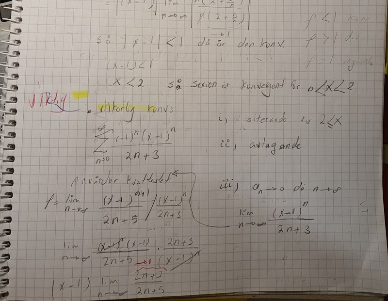 vad jag gjorde helt enkelt var att för att visa att serien är vilkorlig konvergent så tog jag lim . Sedan använde jag mig av kvot testet så jag fick