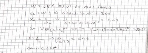 Det framgår inte riktigt heller hur de vill att man ska ange strömstyrkan i svaret. Du skulle kunna svara att strömstyrkans amplitud är 0.96A (eftersom du använde spänningens amplitud i uträkningen). Annars anger man oftast strömstyrkans rms-värde, som är dess amplitud delat med roten ur 2 (vid sinusformad ström)