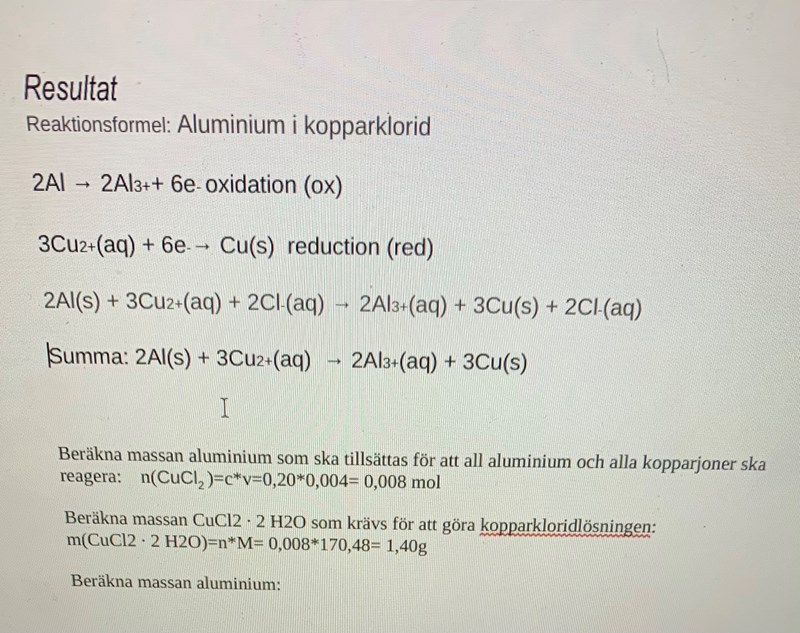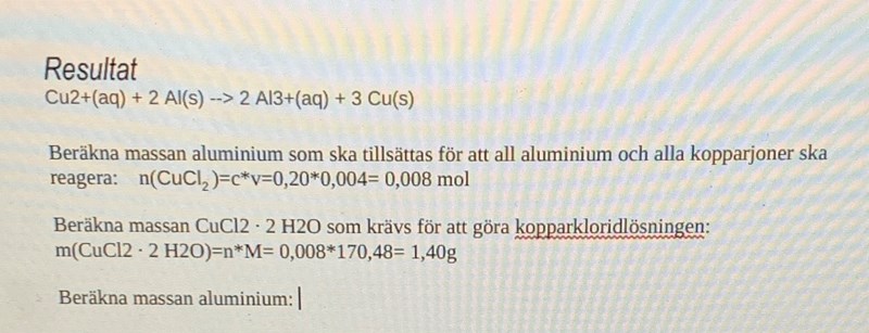 Du vet att det är 0,008 mol kopparjoner från början och att 3 mol koppar reagerar med 2 mol aluminium, d v s 1 mol koppar reagerar med 2/3 mol aluminium. Hur många mol aluminium reagerar med 0,008 mol koppar? Vilken är molmassan för aluminium? Vilken massa av aluminium reagerar med 0,008 mol koppar?