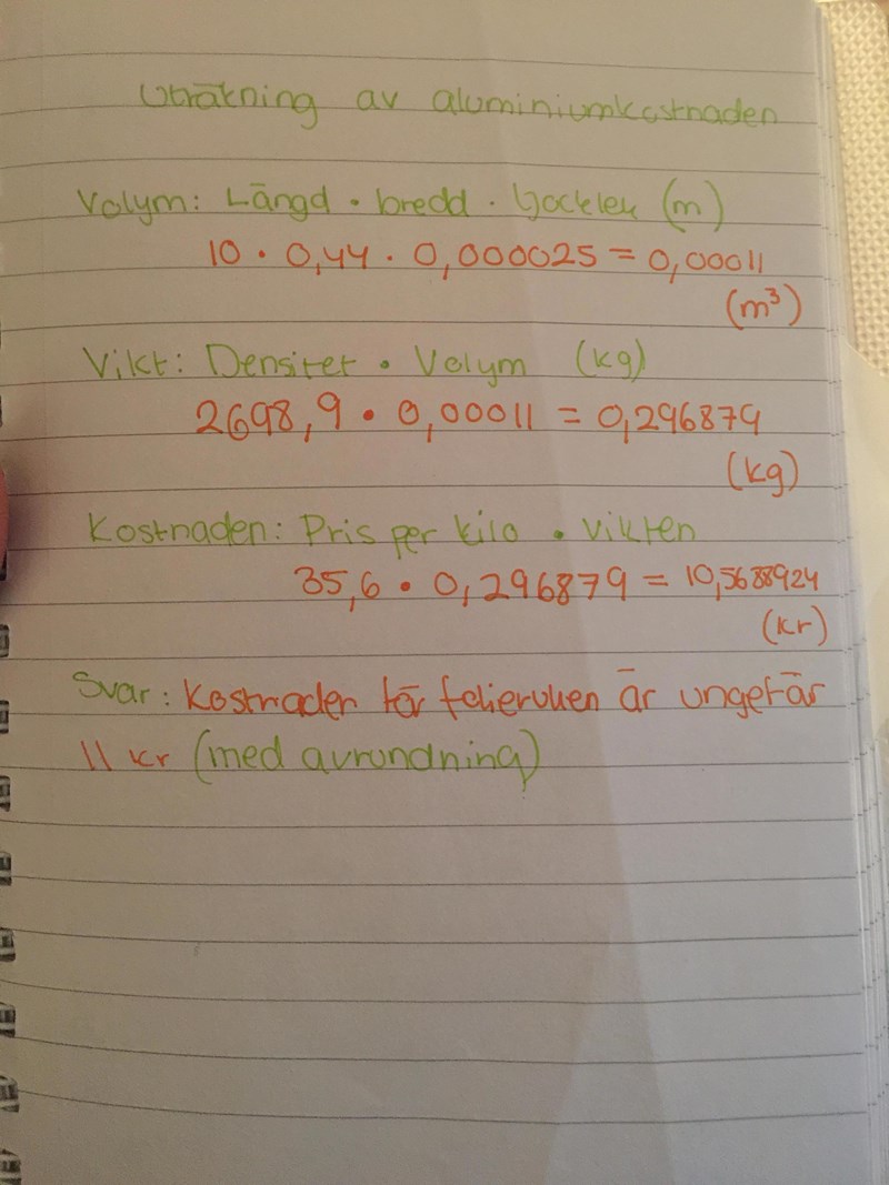 En 10m lång rulle hushållsfolie av aluminium har bredden 44,0cm. foliets tjocklek är 25 mikrometer. densiteten för aluminium är 2698,9 kg/m3. hur stor är kostnaden för folien om priset på aluminium är 35,6kr/kg? (Har fastnat på vid denna uppgift)