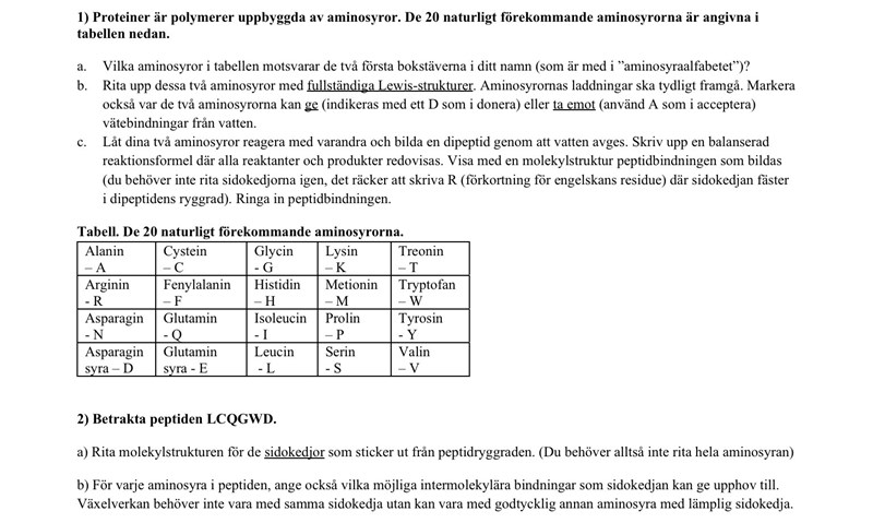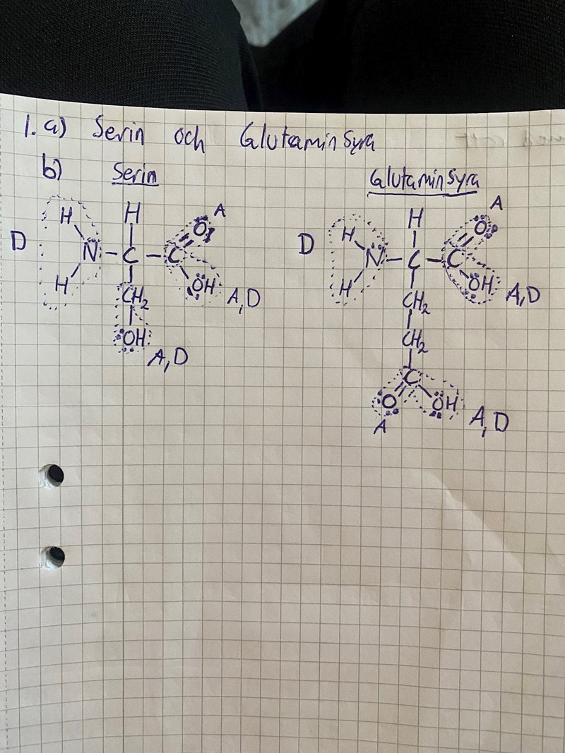 1b) kväveatomen i aminogrupperna kan även delta som vätebindningsacceptorer, genom sitt fria elektronpar. Den formen du ritat ut gäller för aminosyrorna i fast form, men när de löses i vatten kommer protoneringen av amino- och karboxylsyragrupperna att ändras beroende på vilket pH det är.