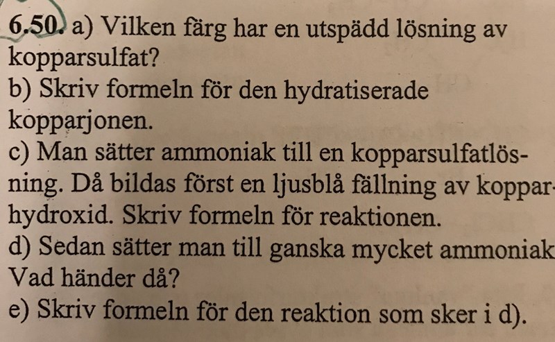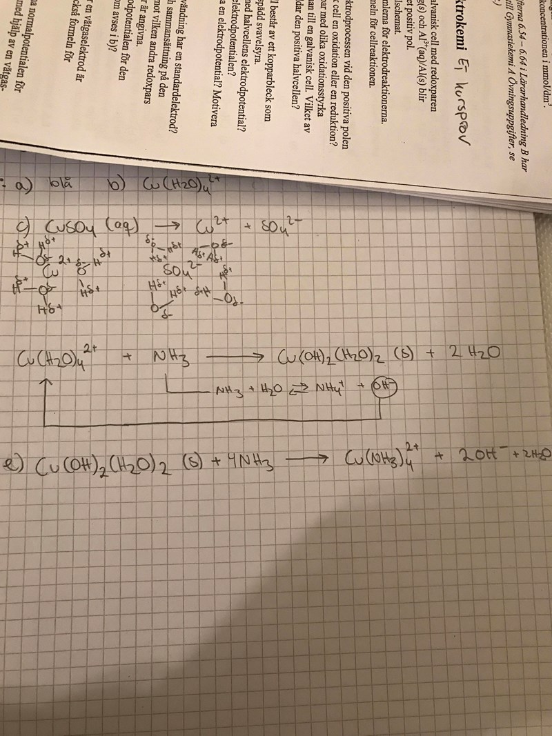 Skriv reaktionen i c) i flera steg - ett steg där ammoniak reagerar med vatten och det bildas hydroxidjoner (och ammoniumjoner), och ett steg där hydroxidjonerna reagerar med (hydratiserade) kopparjoner.
