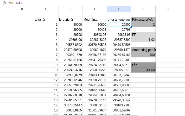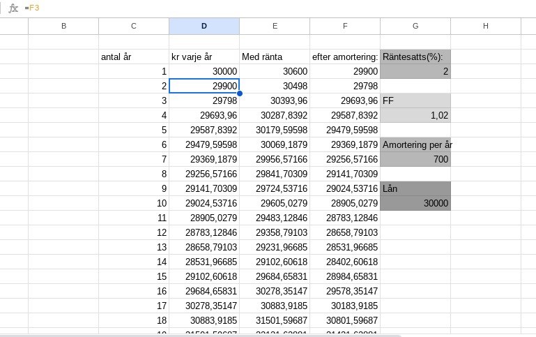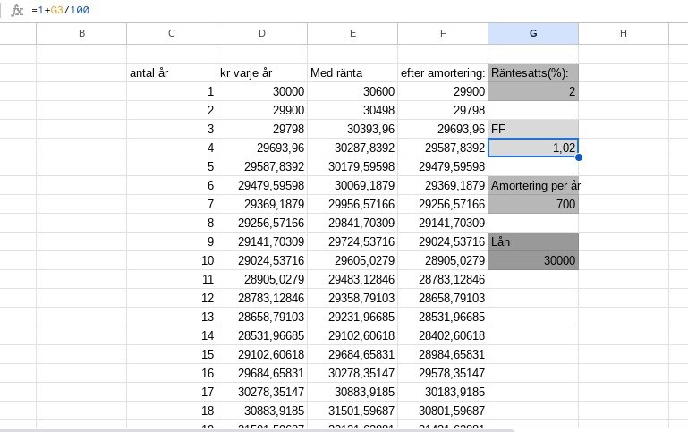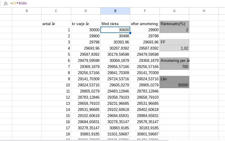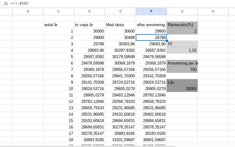 Hur gör man bäst ett kalkylark för amortering av ett lån? jag försökte mig på det, men tror det blir helt fel då lånet blir större fastän jag betalar av det. Här är hur jag gjorde: