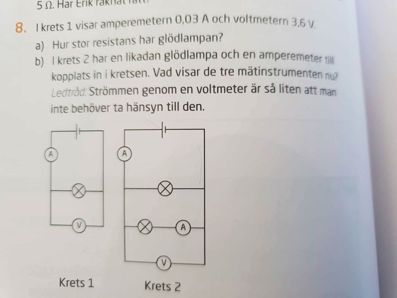 Hallå, svaret på denna frågan (b), blir tydligen att voltmetern visar 3,6 V, den undre amperemetern visar 0,03 A, och den övre amperemetern visar 0,06 A. Jag kan verkligen inte fatta varför den undre amperemetern visar 0,03 A och den övre amperemetern visar 0,06 A. Skulle någon kunna förklara varför det blir såhär?