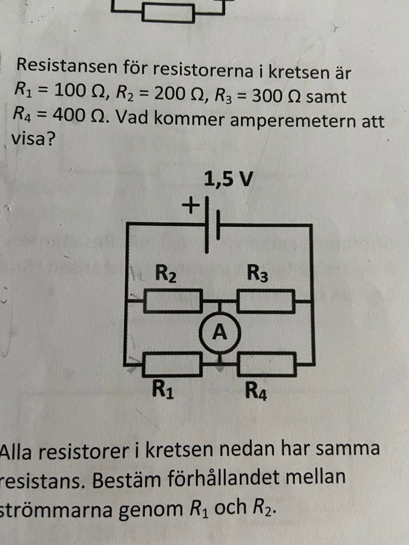 En ideal amperemeter har resistansen 0. En amperemeter med tillräckligt liten resistans kommer att verka som en kortslutning och brinna i den här uppkopplingen. Är amperemeterns resistans angiven tidigare i texten?