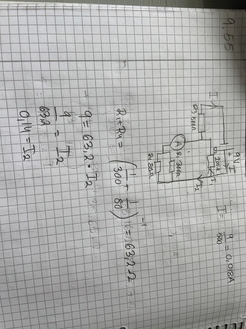 Nej, spänningen över R1//R4 är inte 9 V. En del av spänningen förbrukas av det högra motståndet på 500 ohm.