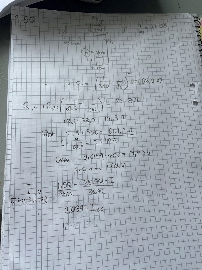 Då vet du att strömmen delar upp sig i två grenar och att spänningen över R2 = spänningen över R1//R4 = 1,52 V. Hur stor är strömmen genom R1//R4? Det är detta du vill ta reda på.