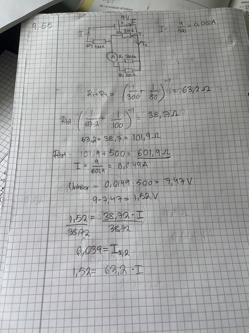 Skriv lite mer, så är det enkklare att hänga med. Jag är (med viss ansträngning, eftersom Rtot betyder olika saker på olika rader) med på att spänningen över de tre parallellkopplade resistorernaa till höger är 1,52 V, sedan blir det bara "siffersallad" och jag hänger inte med på vad du beräknar.