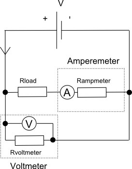 "Eftersom amperemetern har så liten resistans kommer det att gå en mycket stor ström genom den. Den är ju direkt ansluten till batteriet. En mycket stor ström genom en amperemeter kan förstöra den." (Se följande bild)
