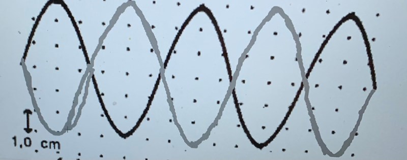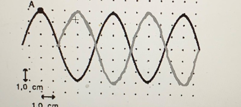 Vågen kommer att röra sig åt höger (det syns av pilen). 0,30 sekunder betyder 3 prickar bort. Rita in den nya kurvan. Var är den nya kurvan i läge A?