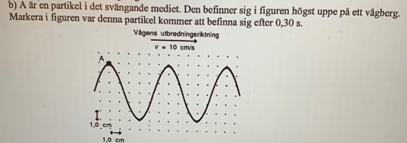 Partikeln A rör sig upp och ner, den flyttar sig inte åt höger. Var befinner sig partikeln A när det hr gått 0,3 sekunder?