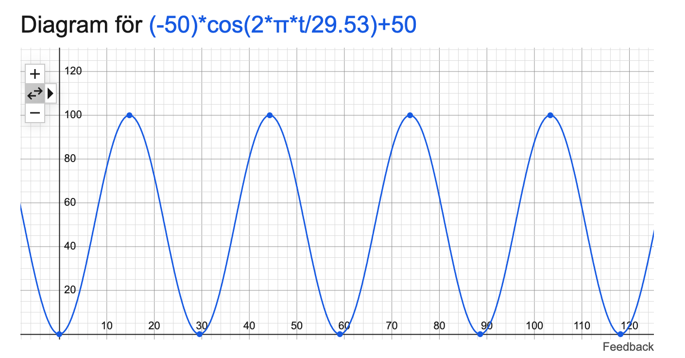 Matteärsvår skrev:Pieter Kuiper skrev:Så t=0 är nymåne. Då ska f(0) alltså vara 0 %.