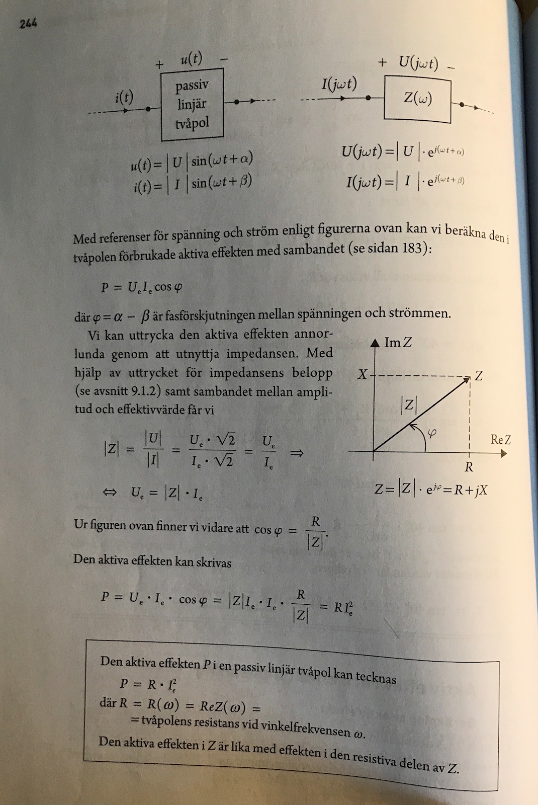 ThomasN skrev:För aktiv effekt, som brukar betecknas P, är spänning och ström i fas. Det är fallet med spänning och ström i en resistor. Denna kan uträtta ett arbete som ljus, rörelse eller i resistorn, värme.