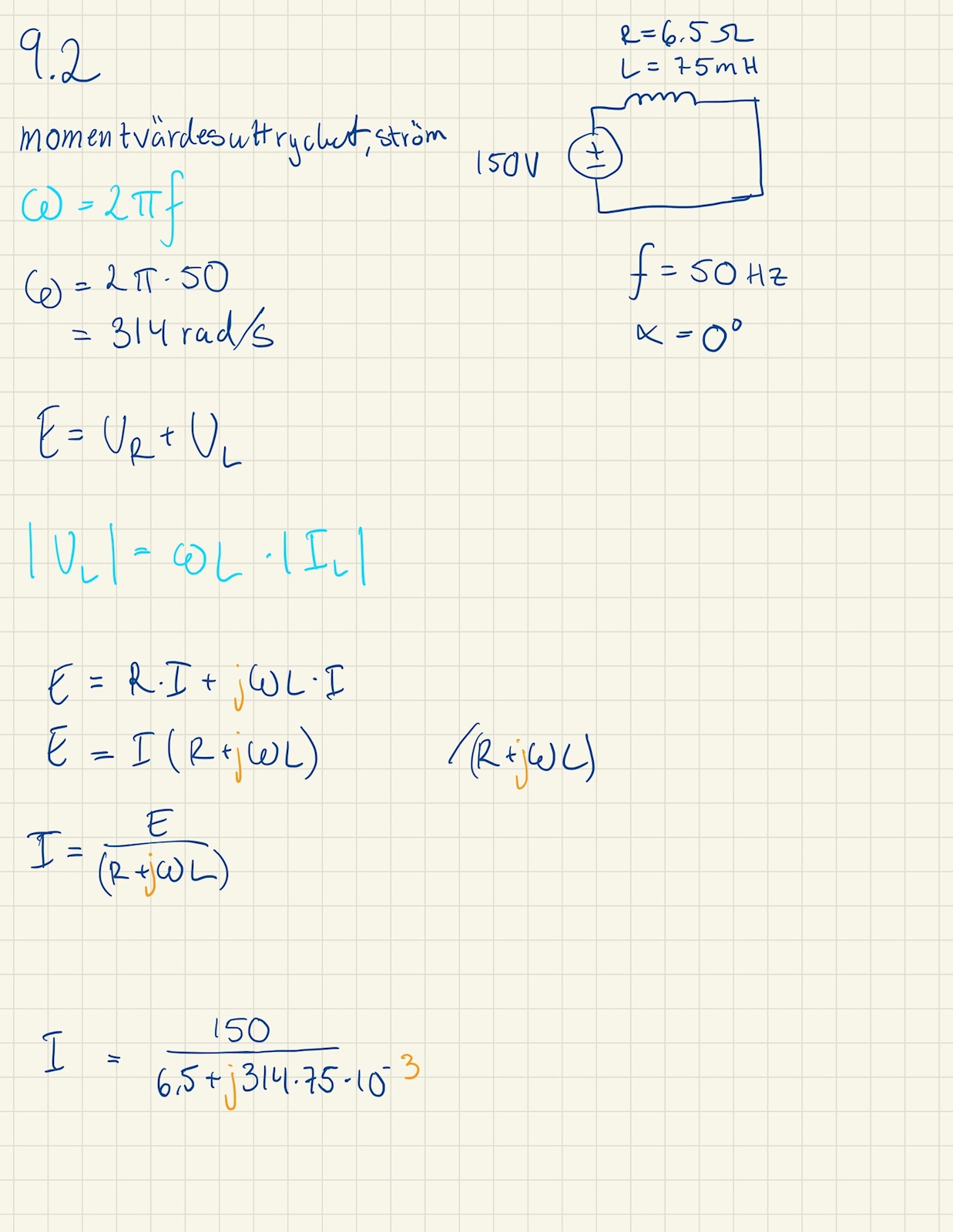 Det står i uppgiften att du ska beräkna uttrycket för momentanströmmen. Nu ser det ut som att du har beräknat rms-värdet istället (eftersom 150V polspänning måste vara ett rms-värde).