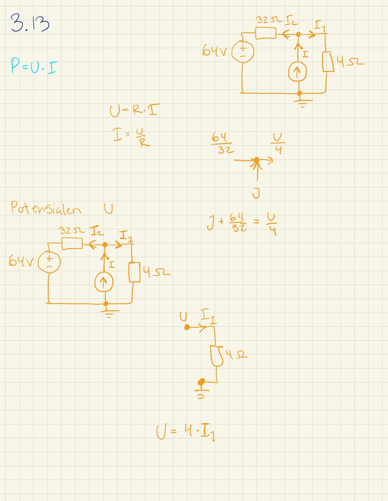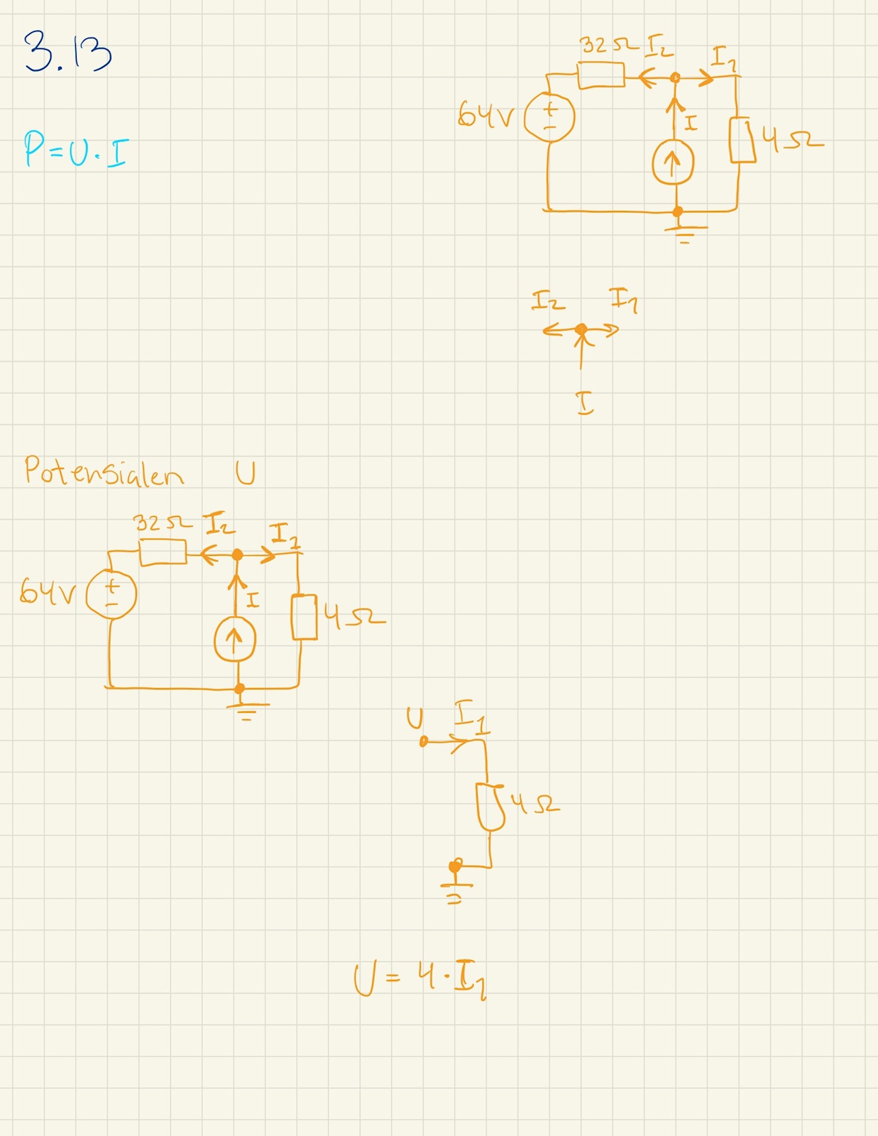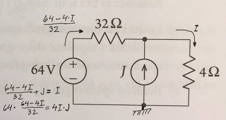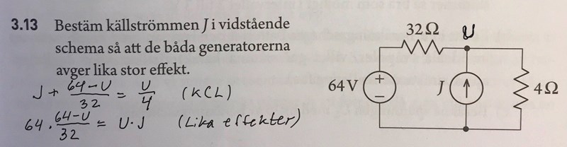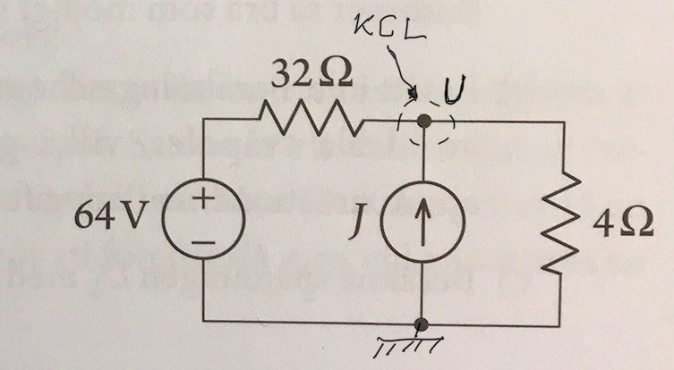 Jorda undersidan på strömkällan. Kalla potentialen på andra sidan strömkällan för U. Teckna KCL för den inringade noden med variablerna U och J. Skapa en andra ekvation som säger att strömkällans avgivna effekt är lika stor som spänningskällans avgivna effekt (också med de två variablerna U och J).