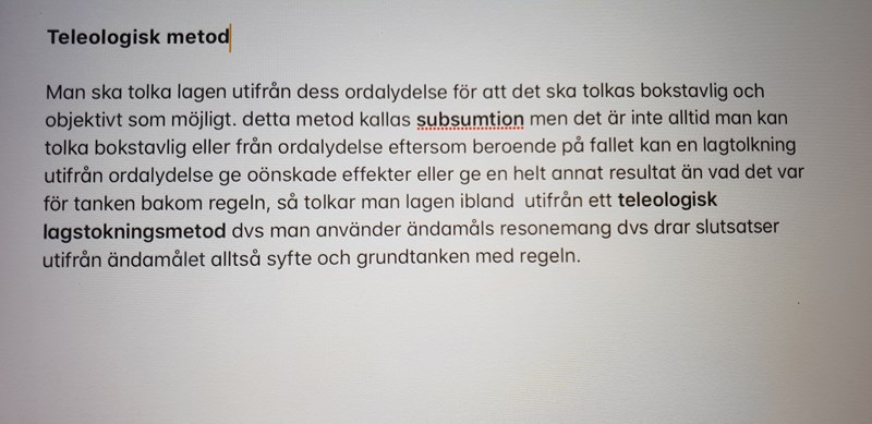 Förklaring till teleologisk lagtolkningsmetod har jag skrivit ovanför (i bilden, jag skrev som jag förstod ). Men förstår inte analogislut, förklaringen för analogislut i boken liknar förklaring för teleologisk metod, men de är väl olika?? 🤔
