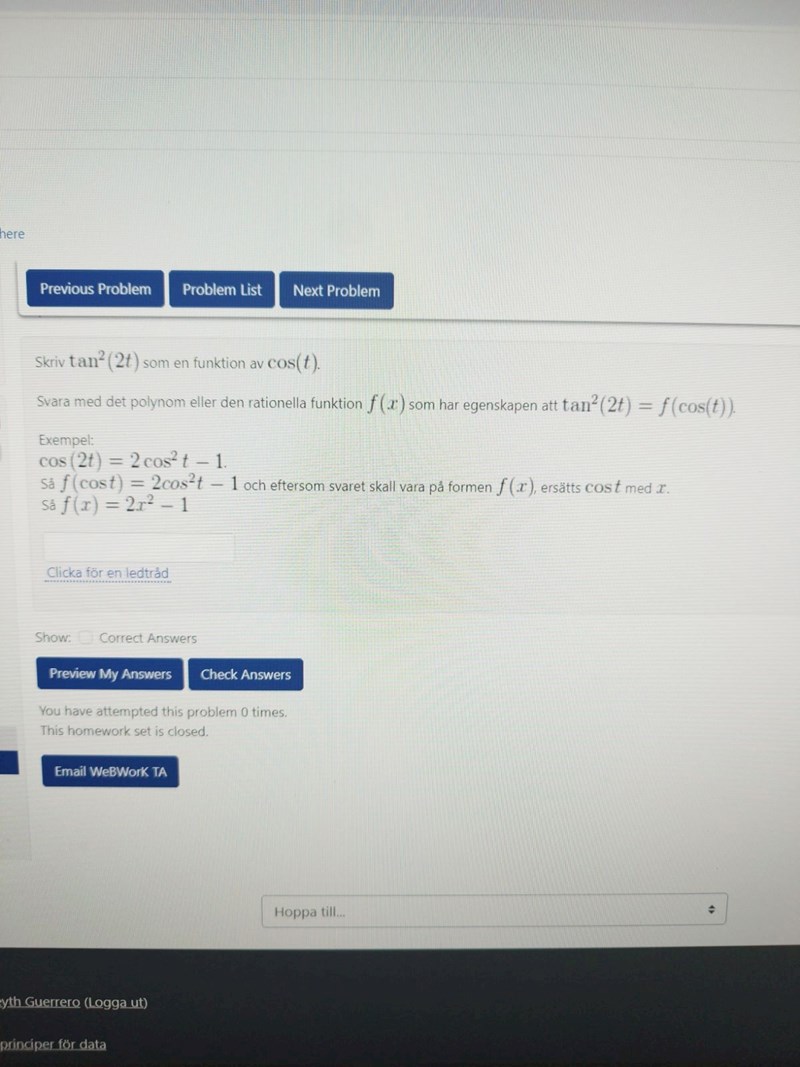 Du skall skriva om uttrycket tan2(2t) så att det beror bara på variablen cos(t), inte t ex sin(t) eller cos(2t). Börja med att göra dig av med besvärliga tan(2t) och ersätt det med sin(2t) och cos(2t). Använd sedan formlerna för dubbla vinkeln för att göra om det till  ett uttryck som beror på sin(t) och cos(t). Hur ser uttrycket ut när du har kommit så långt?