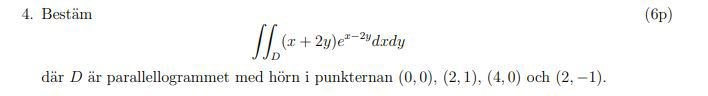 Du transformerar så att du får nya variabler u och v, och sidorna på parallellogrammet blir u = nån konstant, u = nån annan konstant, v = osv.