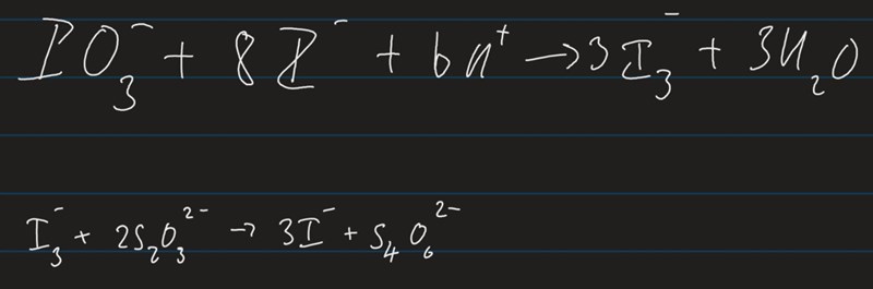 Vitsen med det hela är att tillsätta jodidjoner i överskott från början så att alla jodatjoner förbrukas. Tillsätter man stärkelse får då lösningen en blålila färg. Tillsätter man nu tiosulfat kommer lösningen att avfärgas och bli färglös när alla jodmolekyler har reducerats tillbaka till jodidjoner. Man kan beräkna hur många mol tiosulfat som tillsattes och hur många mol molekylärt jod som det i så fall har reagerat med. Detta motsvarar mängden jod som bildades i den första reaktionen. Utifrån den kan man sedan räkna ut hur många mol jodatjoner som fanns från början. Hänger du med?